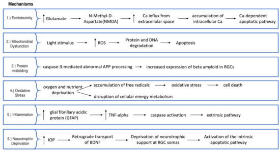 The most common subtype of glaucoma is primary open-angle glaucoma (POAG) [11]. Several risk factors have been identified, with intraocular pressure (IOP) being the only modifiable one. This is determined by a fine balance of aqueous humor production from the ciliary body and drainage through both the trabecular meshwork and the uveoscleral pathway [12]. If the resistance to drainage [12] causes an IOP that is high enough to risk further glaucomatous damage, pressure can be reduced with medical, laser and surgical therapy [13,14,15]. Other non-modifiable risk factors identified in glaucoma include increasing age [16], black race [17], family history [18] and myopia [19,20]. There are several theories hypothesized for the mechanism of RGC damage, with multiple disease variants being possible although they are still indistinguishable. The lamina cribrosa is the structure through which the optic nerve fibers penetrate the sclera of the eye and has been proposed as a site of nerve fiber vulnerability due to mechanical stress. Intraocular pressure has been suggested to cause damage to axons within the lamina, interrupting axonal transportation, which is known to occur early in experimental glaucoma and has been found in post-mortem specimens [21,22]. Another theory involves excitotoxicity, which implicates excess glutamate activity (the main excitatory neurotransmitter in the central nervous system) in the triggering of apoptosis [23,24]. In addition, other theories of vascular dysregulation [25], immunological factors [26] and oxidative stress [27,28] remain foci of interest for potential novel therapies (Figure 1 and Figure 2).