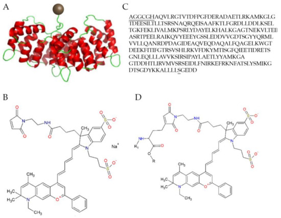 The structure of the Dy-776-mal labelled annexin V128 molecule: (A) Diagrammatic representation with the Dy-776-mal label represented with a brown sphere and the annexin molecule in red and green; (B) The molecular structure; (C) The optimized amino acid sequence of Anx V128, with the additional amino acids at the N-terminus containing the cysteine and mutated serine; and (D) The molecular structure of the fluorescent conjugation of ANX776 [85].