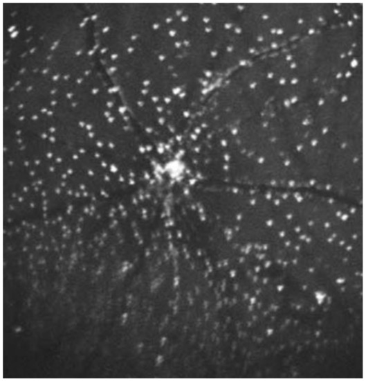 DARC imaging demonstrating the detection of fluorescently-labelled annexin A5 molecules in apoptosing retinal ganglion cells in a rat model of ocular hypertension [102]. The model is formed using the injections of hypertonic saline into episcleral veins. Fluorescent markers have been introduced by intravitreal injections of ANX776 and imaged using confocal scanning laser ophthalmoscopy. The confluent staining at the optic nerve head is as yet of unknown significance, but may represent axonal staining as the nerve fibers enter the optic disc.