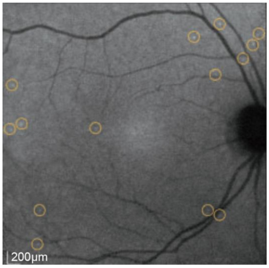 As the technique has developed, an average of 100 frames has been introduced in combination with eye-tracking to achieve a higher signal-to-noise ratio. After this, the images undergo several transformations to compensate for non-linear optical distortions and large non-enhancing structures, such as the blood vessels [87,88,89]. Analyzing these images produces a “DARC count” using a template-matching approach [90] to detect the number of annexin A5-labelled spots. These spots are seen as hyperfluorescent spots measuring between 12 and 16 μm in diameter (Figure 4 and Figure 5).