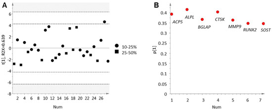 Principal component analysis of seven assigned gene products associated with bone cell activity in 28 bone metastases samples. (A) score plot for the first principal component. Each dot corresponds to one metastasis sample collected from prostate cancer patients. Bone content was determined within the range of 10–25% or 25–50% by histological examination of tissue sections; (B) loading plot showing included gene probes. Positive loading values (p) represent genes expressed at high levels in samples with positive score values (t) and vice versa.