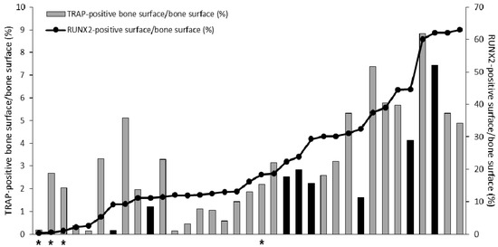 Percentage of bone surface lined by tartrate-resistant acid phosphatase (TRAP)-positive and runt-related transcription factor 2 (RUNX2)-positive cells, respectively. Each bar represents TRAP-positive bone surface in one patient sample and the corresponding dot represent the RUNX2-positive surface in the same patient. Castration-resistant prostate cancer patients are represented by grey bars and treatment-naïve patients by black bars. Patients who had undergone chemotherapy are denoted by asterisks.