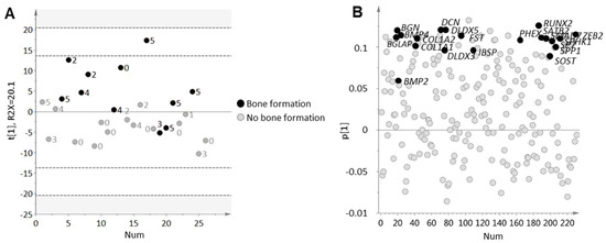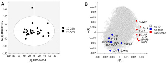 Orthogonal projections to latent structures analysis extracting the maximal variation in transcriptome data that co-vary with bone cell activity described by the weighted gene expression of ACP5, ALPL, BGLAP, CTSK, MMP9, RUNX2 and SOST t[1] score vector. (A) score plot of 28 bone metastases samples where each dot corresponds to one metastasis sample collected from prostate cancer patients; (B) loading plot of 13847 analyzed gene products. Genes with positive loading (p) are highly expressed in metastases with high bone cell activity and vice versa.
