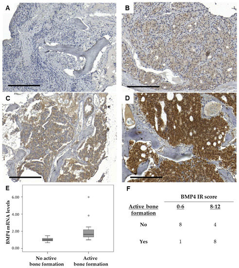 Representative sections of bone metastasis sections showing bone morphogenetic protein 4 (BMP4) immunostaining of metastatic tumor cells scored as negative (0) in (A); weak (1) in (B); moderate (2) in (C) and intense (3) in (D), with a distribution between 0 and 4 (not shown) giving immunoreactive scores (IR scores) in the range of 0–12. Bone metastases with ongoing bone formation had significantly higher BMP4 mRNA levels (E) and BMP4 IR scores (F). Bar indicates 200 µm. Circles indicate outliers and extreme values.