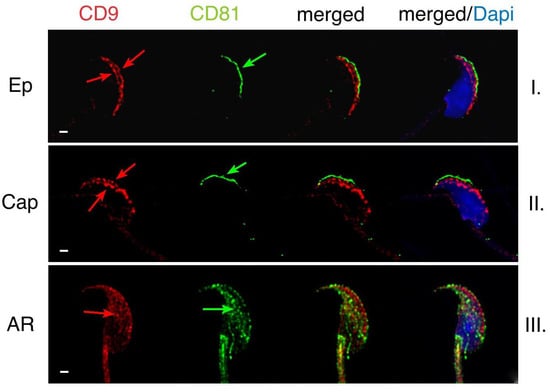 Dynamics of CD9 and CD81 in their mutual localization in human sperm captured by confocal microscopy. (I) In ejaculated sperm, both CD9 (red) and CD81 (green) are present in the apical acrosome. (II) During capacitation no changes in localization of both proteins occur. (III) After completing AR, the plasma membrane covering the apical acrosomal area and the outer acrosomal membrane are both lost. The fluorescent signal of CD9 is located over the equatorial segment (red arrow) and CD81 disappears from the acrosome. After the acrosome reaction, CD81 is mainly detectable in the postacrosomal region of human sperm head. DAPI (blue). Scale bar represents 1 μm.