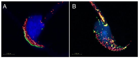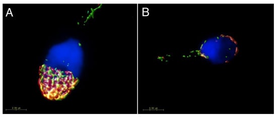 Ejaculated or epididymal, capacitated, and acrosome-reacted sperm were used for preparation of cells smears. Sperm were washed twice in tube with PBS, smeared onto glass slides, and air-dried. Sperm smears were fixed with 3.7% formaldehyde in PBS (pH 7.34) at room temperature for 10 min, followed by washing in PBS. Sperm were blocked with 5% BSA in PBS for 45 min and incubated with primary antibodies: goat polyclonal IgG anti-CD81 (Q14) diluted 1:20 in PBS and rabbit polyclonal IgG anti-CD9 (H110) diluted 1:20 in PBS over night at 4 °C, followed by 1 h of incubation with both secondary antibody together: Alexa Fluor 568 donkey anti-rabbit IgG (H + L) or Alexa Fluor 488 donkey anti-goat IgG (H + L) (Life Technologies, Prague, Czech Republic) diluted 1:500 in PBS at room temperature. After washing, the slides were mounted into a Vectashield mounting medium with DAPI (Vector Lab., Burlingame, CA, USA). Fluorescent images were collected with high-end confocal microscope Carl Zeiss LSM 880 NLO at Imaging Methods Core Facility at BIOCEV (Vestec, Czech Republic). Huygens Professional version 17.10 (Scientific Volume Imaging, Hilversum, The Netherlands, Available online: http://svi.nl) software was used for deconvolution of confocal images and for colocalization maps. An open-source software Fiji [] was used for image processing.