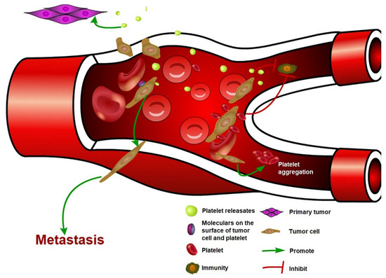 The interaction between platelets and cancer cells is bidirectional, and cancer cells have profound effects on platelet generation and activation. Cancer patients often have an abnormal platelet count and activation. More than five-fold increase of thrombosis and thromboembolism incidences have been detected in cancer patients compared with normal person [102]. Furthermore, the extracellular vesicles derived from breast cancer cell lines induce tissue factor-independent platelet activation and aggregation, providing a potential mechanism for cancer-associated thrombosis [103]. Fiorella Guadagni et al. showed that the cancer-associated oxidative stress also contributes to persistent platelet activation [104].