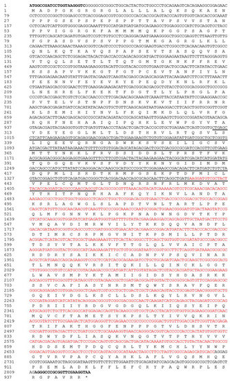 The complete coding sequence and the assumed amino acid sequence of PxAgo3. The coding sequence is of 2832 bp, starting from ATG marked in boldface and ending with TAA denoted with asterisk (*). The protein sequence is of 943 aa under the nucleotide sequence, with two motifs of the PAZ domain (underline, position 337–477) and the PIWI domain (red in color, position 464–909). Besides this, PCR primers (sense and antisense) are highlighted in bold.