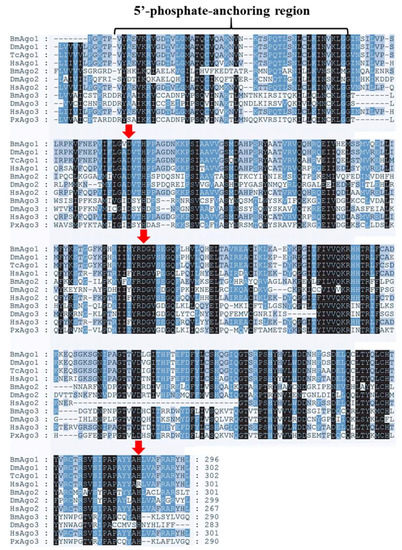Multiple-sequence alignment of the PIWI domain of PxAgo3 with those of other species. Multiple-sequence alignment of the PIWI domains of PxAgo3 and descriptive Ago proteins by using the ClustalW software (Omega, Bienne, Switzerland). The undistinguishable amino acids are marked in black shadow, whereas alike amino acids are denoted in blue and grey shadow. The location of catalytic residues of DDH motif are specified with red arrows. Bm means Bombyx mori; Dm, Drosophila melanogaster; Tc, Tribolium castaneum; Hs, Homo sapiens; Px, Plutella xylostella.