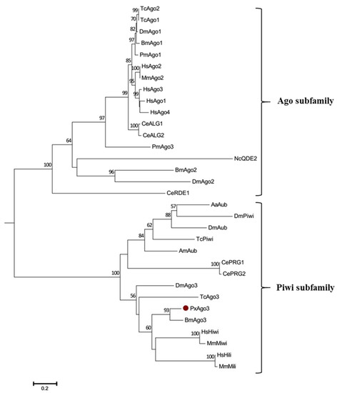 The phylogenetic tree showed that PxAgo3 protein belongs to the Piwi subfamily. Ago3 has been reported to belong to the Piwi subfamily in B. mori [16,32,33], D. melanogaster [22], and Aedes aegypti [34]. however, Ago3 belongs to the Ago subfamily in C. elegans [14,35] and H. sapiens [36,37].
