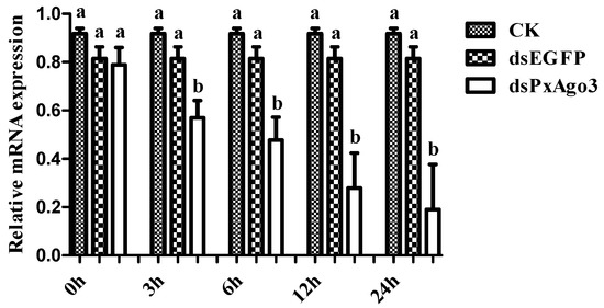 The expression of PxAgo3 was significantly more suppressed by dsPxAgo3 in the 3rd instar larvae of P. xylostella than by CK and dsEGFP. The suppression was first observed in 3 h after treatment and maintained up to 24 h (Figure 4).
