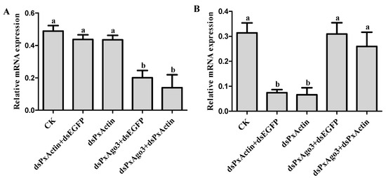 Effects of PxAgo3 knockdown on PxActin suppression in P. xylostella cells. (A) PxAgo3 expression; (B) PxActin expression. Different lowercase letters represent significant differences among treatments at each time interval (Tukey’s post hoc test, p < 0.05).
