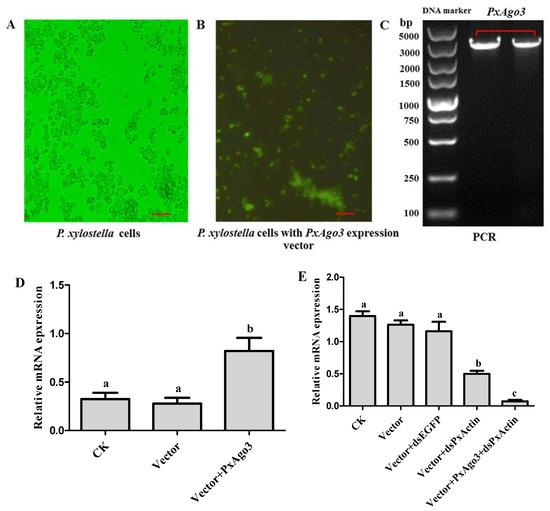 Effects of PxAgo3 overexpression on PxActin suppression in P. xylostella cells. (A) P. xylostella cells; (B) the phenotypical expression of PxAgo3 expression vector into P. xylostella cells. Scale Bar: 100 µm; (C) PCR product of PxAgo3 using P. xylostella cells with PxAgo3 expression vector as the template; (D) the expression level of PxAgo3 in P. xylostella cells; (E) the expression level of PxActin in P. xylostella cells. Different lowercase letters represent significant differences among treatments (Tukey’s post hoc test, p < 0.05)