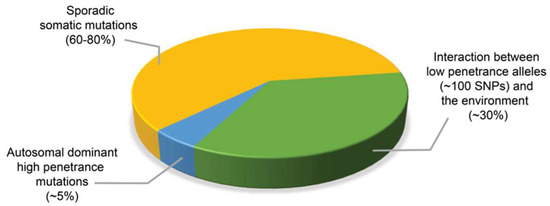 Approximate contribution of germline mutations, low penetrance alleles and sporadic somatic mutations to prostate cancer incidence. While most prostate cancer arise from sporadic somatic mutations, about 5% of prostate cancers develop from autosomal dominant highly penetrant germline mutations, and approximately 30% of cases of prostate cancer occur as a result of interaction between genes with low penetrance alleles and the environment.