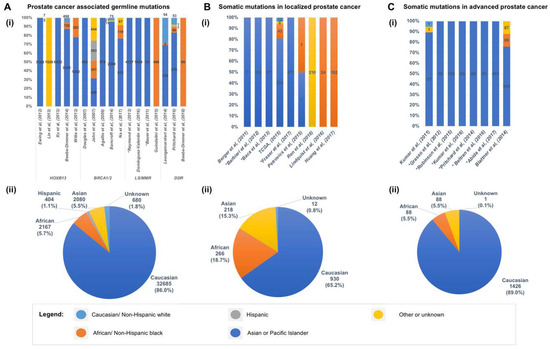 Racial and ethnic disparity in genomic studies of prostate cancer. The distribution of race and ethnicity of cohorts analyzed for germline mutations (A), somatic mutations in localized prostate cancers (B), and somatic mutations in advanced or metastatic castrate resistant prostate cancers (C), in each study reviewed (i), and when grouped together (ii). * In studies which the race or ethnicity of cohort were not specified, the cohort were assumed to be largely Caucasian based on the population of the locale where the study was conducted.