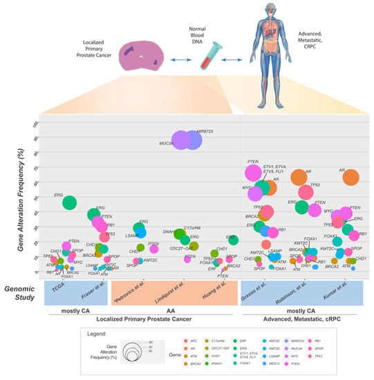 Frequency of somatic gene alteration events reported in selected genomic studies of localized primary prostate cancer and in advanced, metastatic, and/or castrate resistant prostate cancer. Size of circle is proportional to the frequency of gene alteration events (point mutations, deletions, amplifications or gene fusions). * Only gene alteration events in African American cases are shown.
