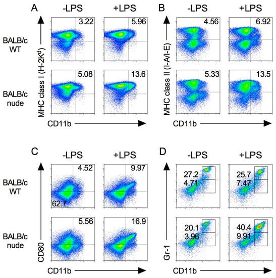We first characterized the population of immune cells in the spleens of nude mice in which both CD4+ and CD8+ T cells were absent. As shown in Figure 1, major histocompatibility complex (MHC) class I and II molecules and CD80, which are required for T cell activation, are highly expressed in CD11b+ M1 macrophage [17,18]. Splenic MHC class I expression on CD11b+ cells increased following LPS stimulation in both BALB/c wild type (WT) and BLAB/c-nude mice (Figure 1A). The trend was also observed in MHC class II and CD80 expression on CD11b+ cells (Figure 1B,C).