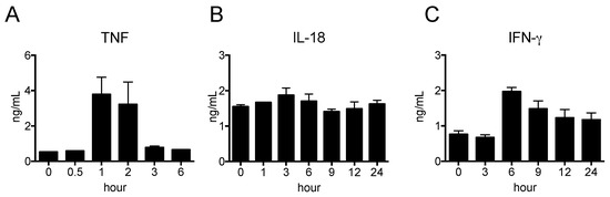 Pro-inflammatory cytokine productions in nude mice stimulated by LPS. LPS was i.p. injected and blood samplings were carried out at indicated time-points. The serum levels of TNF (A), IFN-γ (B) and IL-18 (C) were determined by ELISA. The data are presented as the mean ± SEM. n = 5.