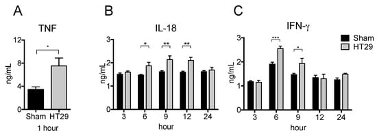 To examine the respective cytokine production in the xenograft tumor model, we subcutaneously (s.c.) injected human colon adenocarcinoma cell lines (HT29) or PBS (as a control) into nude mice and then i.p. injected LPS at 21 d after inoculation. As shown in Figure 3A,C, the serum levels of TNF and IFN-γ significantly increased in HT29 tumor-bearing mice at 1 h and at 3–6 h, respectively. Furthermore, the serum level of IL-18 was also significantly increased in HT29 tumor bearing mice at 6–12 h (Figure 3B). These results suggest that HT29 tumor-bearing mice have more potential to promote pro-inflammatory responses than sham control mice.