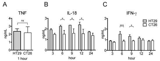 Serum pro-inflammatory cytokine levels in xenograft and allograft tumor models after LPS stimulation. HT29 cells or CT26 cells were s.c. transplanted into BALB/c-nu/nu mice. On the day 21 after transplantation, 500 μg LPS was i.p. injected and peripheral blood was collected at indicated hour. The serum levels of TNF (A), IFN-γ (B), and IL-18 (C) were detected by ELISA. The data are presented as the mean ± SEM assessed by a Student’s two-tailed t-test. * p < 0.05; *** p < 0.001; ns: not significant. n = 5.