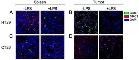 Confocal images of CD80 and MRC1 expression cells in spleen and tumor with or without injection of LPS. HT29 and CT26 tumor-bearing mice were treated with LPS (+LPS) or PBS control (−LPS) on the day 21 from tumor transplantation and tumor and spleen were collected after 24 h from LPS treatment. (A) Spleen in HT29 tumor-bearing mice. (B) Tumor in HT29 tumor-bearing mice. (C) Spleen in CT26 tumor-bearing mice. (D) Tumor in CT26 tumor-bearing mice. CD80, MRC1, and cell nuclei (DAPI) are represented in green, red, and blue, respectively. Representative images from at least three independent experiments are shown. Each scale bar indicates 50 μm.