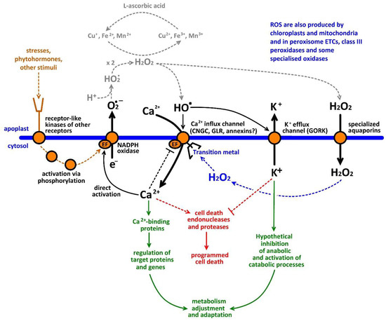 The concept of reactive oxygen species (ROS)-Ca2+-hub in the plasma membrane of higher plants. Stresses and regulatory stimuli can react with cell surface receptors leading to the activation of NADPH-oxidases (or directly activate ion channels). NADPH oxidases produce superoxide (O2•−), which binds H+ and forms hydroperoxyl radicals (HO•2), which undergo dismutation reaction forming H2O2. H2O2 can be reduced in Haber-Weiss cycle using electrons from transition metals, which can be reduced by l-ascorbic acid. H2O2 reduction leads for formation of HO• in the close proximity (clusters) to ROS-activated Ca2+-permeable cation channels. Cell wall transition metals are required for Haber-Weiss cycle in the apoplast. Channels are activated in response to increased HO• production and mediate Ca2+ influx and K+ efflux. Hydrogen peroxide can hypothetically activate channels from inside via reaction with transition metal binding sites (via generation of HO•). ROS-induced cytosolic Ca2+ elevation results in activation of signaling and regulatory cascades, stimulation of exocytosis and growth as well as induction of programmed cell death. ROS-activated efflux of K+ can lead to stimulation of programmed cell death, autophagy or metabolic adjustment, which is required for changing plant metabolism during stress responses and releasing energy for reparation needs [14].