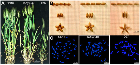 Morphological traits and chromosome patterns of introgression line TaAy7-40 and its parents CN16 and D97. (A) plants of TaAy7-40, CN16, and D97; (B) seeds of TaAy7-40, CN16, and D97; and (C) the number of root-tip chromosomes.