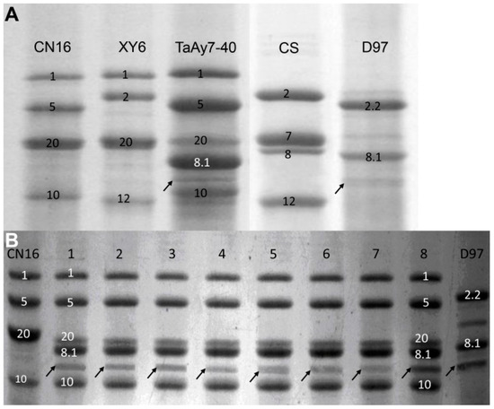 Sodium dodecyl sulfate polyacrylamide gel electrophoresis (SDS-PAGE) analysis showed that the female CN16 had five HMW-GSs, including 1Ax1 at the Glu-A1 locus, 1Bx20 + 1By20 at the Glu-B1 locus, and 1Dx5 + 1Dy10 at the Glu-D1 locus. 1Ay was not detected in CN16. The male D97 had three HMW-GSs, including 1Ax2.2 [36] + 1Ay at the Glu-A1 locus and 1By8.1 at the Glu-B1 locus. However, the resulting introgression line TaAy7-40 possessed six HMW-GSs, including 1Ax1 and 1Ay at the Glu-A1 locus, 1Bx20 and 1By8.1 at the Glu-B1 locus, and 1Dx5 and 1Dy10 at the Glu-D1 locus, compared with the HMW-GSs composition of D97, XY6, and CN16 (Figure 2A). Further analysis by eight randomly sampled grains confirmed that the six HMW-GSs were highly stable in TaAy7-40 (Figure 2B) and that its 1Ay had electrophoretic mobility similar to the fast subunit 1Ay in the D97 profile (Figure 2A,B).