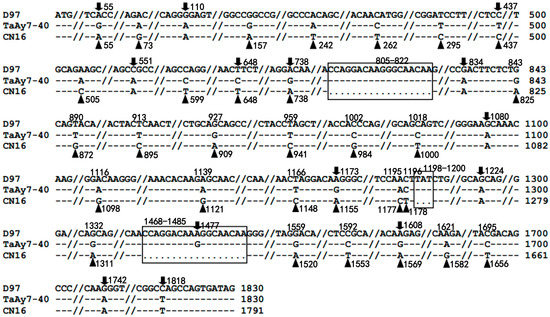 Comparison of the three cloned 1Ay ORFs revealed that a total of three insertions and deletions (InDels) at position 805-822, 1198-1200, and 1468-1485 were detected (Figure 4). Simultaneously, 38 single nucleotide polymorphisms (SNPs), including 32 transitions and six transversions, were identified. In total, 14 SNPs, including 13 transitions and one transversion, were found between D97and TaAy7-40. In contrast, 30 SNPs, including 25 transitions and five transversions, were identified between CN16 and TaAy7-40.