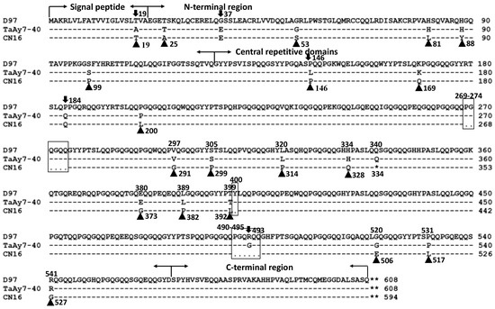 A similar comparison was made for the predicted polypeptide sequences. All of the three amino acid sequences shared the typical characteristic structure of HMW-GS (Figure 5), which contains a signal peptide, N-terminal, C-terminal, and central repetitive region [2]. Three deletion polymorphisms at position 269–274, 400, and 490–495 were detected in CN16, five single amino acid polymorphisms (SAPs) were identified between TaAy7-40 and D97, and 17 SAPs were found between TaAy7-40 and CN16 (Figure 5). TaAy7-40 and D97 possessed complete 1Ay polypeptide structures, while CN16 encoded a truncated polypeptide as a result of the premature termination codon TAG at position 1000 to 1002 of 1Ay ORFs.