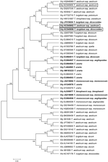 Hitherto, several active Glu-1Ay genes have been isolated from Triticum sources, such as Triticum timopheevii ssp. timopheevii (AAGG, 2n = 4x =28) [15], T. urartu (AA, 2n = 2x = 14) [16,17], T. monococcum ssp. aegilopoides (AA, 2n = 2x = 14) [18], T. monococcum ssp. monococcum (AA, 2n = 2x =14) [16,19], cultivated emmer wheat (T. turgidum ssp. dicoccum) (AABB, 2n= 4x =28) [16], and wild emmer wheat (T. turgidum ssp. dicoccoides) (AABB, 2n = 4x = 28) [20,21]. It was proposed that the active Glu-1Ay genes from the related Triticum species could be used for improving wheat processing quality [16,18,22].