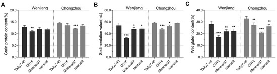 Two-way variance analysis of the difference for three quality traits of introgression lines TaAy7-40, CN16, and the two common wheat cultivars Mianmai 37 and Neimai 9 in Wenjiang and Chongzhou environments. The three PQPs include grain protein content (A), sedimentation value (B), and wet gluten content (C). *, **, and *** represent significance levels at 0.05, 0.01, and 0.001 between TaAy7-40 and each of the other three cultivars, respectively.