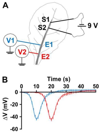 Figure 1. Action potentials directly recorded in Arabidopsis leaves. (A) Scheme of the experimental setup. (B) Time-course of averaged APs (voltage as a function of time) at electrodes E1 (blue) and E2 (red) recorded in the electrically-stimulated WS ecotype (Means ± SE, n = 25). Zero time: start of the 5-s electrical stimulation.