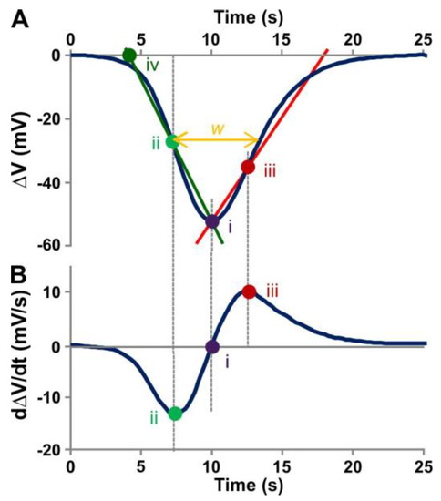 Figure 2. Analysis of action potentials. APs were recorded relative to the baseline, converted to a Microsoft excel file and imported into SigmaPlot (Version 11; Systat Software, San Jose, CA, USA). (A) For analyses, data were smoothed by calculating the running average over four neighbouring points using the “2 D smoothing function”. (B) dΔV/dt values were then obtained using the “Compute 1st Derivative” function. To elaborate standardised characteristic parameters, an AP was approximated by a triangle shape (green and red lines). For this, the peak of the AP (Point i) as well as the reversal Points ii and iii (dΔV/dt = 0), were determined. The intersection of the linear regression between Points i and ii with the time axis determined the start point of the AP (Point iv). The AP signal width (w) was measured as the change in time (Δt) at the half-maximum AP amplitude. The propagation speed of the signal was taken from the measured distance between the two recording electrodes at E1 and E2, divided by the time in seconds between the two start points (Point iv) at E1 and E2.