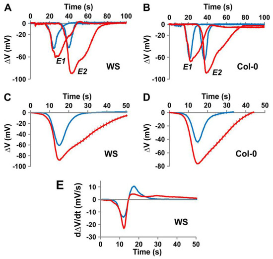 Figure 3. Dynamic characteristics of action potentials in wildtype compared to gork knockout mutants. (A,B). Time-course of typical APs (voltage as a function of time) recorded at electrodes E1 and E2 in WS wildtype ((A), blue) compared to that of the WS gork knockout ((A), red) and the Col-0 wildtype ((B), blue) compared to that of the gork knockout in the Col-0 background ((B), red). Zero time: start of the 5-s electrical stimulation (Figure 1A). (C) Time-course of averaged APs from the E2 recording electrode for the gork knockout mutant in the WS background (red) and the WS wildtype (blue) (n = 25). (D) Time-course of averaged APs from the E2 recording electrode for the gork knockout mutant in the Col-0 background (red) and the wildtype Col-0 (blue) (n = 25). (E) Time-course of averaged AP derivatives (dΔV/dt as a function of time) from the E2 recording electrode for the gork knockout mutant in the WS background (red) and the wildtype WS (blue) (n = 25).