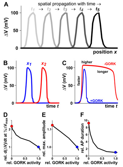 Figure 4. Computational simulation of plant action potentials displayed in a qualitative manner. (A) An action potential induced by a short electrical stimulus then propagates in a self-amplifying manner along the ‘green cable’. Displayed is the calculated membrane voltage for a segment of the cable for five different time points (different grey shades). (B) At two different positions x1 (blue curve) and x2 (red curve) the APs pass at different times. (C) Effect of the presence (blue curve) or absence (red curve) of the K+ conductance of the GORK channel. A ‘green cable’ without GORK channels has APs that rise faster, reach a higher maximal amplitude and last longer. (D) Dependency of the steepness of the initial phase of an AP on the activity of the repolarising K+ conductance. (E) Dependency of the maximal amplitude of an AP on the activity of the repolarising K+ conductance. (F) Dependency of the duration of an AP on the activity of the repolarising K+ conductance. The red and blue dots in (DF) represent the two situations displayed in (C).