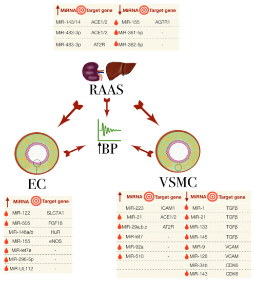 The miRNAs involved in essential hypertension, their association with the RAAS, EC and VSMC and their known target genes. The big central arrows indicate a system/cell type’s influence on another and on the increase in blood pressure (BP). Small arrows in the tables indicate the upregulated (up arrow) or downregulated (down arrow) miRNA expression. Red droplets represent the biomarker potential from detectability in blood samples. EC: endothelial cells; RAAS: renin-angiotensin aldosterone system; VSMC: vascular smooth muscle cells.