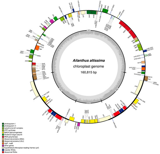 Library preparation was constructed using the Illumina Hiseq 2500 platform at NOVOgene Company (Beijing, China) with an average insert size of approximately 350 bp. The high-quality data (5 Gb) were filtered from raw sequence data (5.2 Gb) using the PRINSEQ lite v0.20.4 (San Diego State University, San Diego, CA, USA) [58] (phredQ ≥ 20, Length ≥ 50), followed by de novo assembling using NOVOPlasty [59] with default sets (K-mer = 31). The seeds and reference plastome used was from the closely related species Leitneria floridana (NC_030482) with high coverage of chloroplast reads ~1500×. Lastly, one contig of Ailanthus altissima was generated and mapped with reference plastome using GENEIOUS 8.1 (Biomatters Ltd., Auckland, New Zealand) [60]. Finally, online web-based server local blast was used to verify the inverted repeat (IR) single copy (SC) junctions.