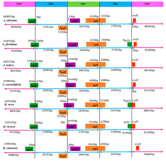 The angiosperms chloroplast genomes are highly conserved, but slightly vary as a result of either expansion or contraction of the single-copy (SC) and IR boundary regions [36]. The expansion and contraction of the IR causes size variations and rearrangements in the SSC/IRa/IRb/LSC junctions [37]. Therefore, in this study, exact IR boundary positions and their adjacent genes of seven representative species from different families in order Sapindales were compared (Figure 2). The functional ycf1 gene crossed the IRa/SSC boundary creating ycf1 pseudogene fragment at the IRb region in all the genomes. Besides, ycf1 pseudogene overlapped with the ndhF gene in the SSC and IRa junctions in four genomes with a stretch of 9 to 85 bp, but ndhF gene is located in SSC region in L. floridana, R. chinensis and A. altissima.