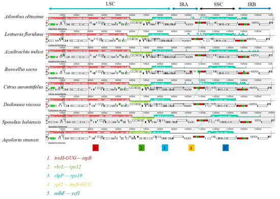 The mauve alignment for seven species revealed that all the genomes formed collinear blocks (LCBs). In particular, all the seven species; A. altissima, Leitneria floridana, Azadirachta indica, Citrus aurantiifolia, Boswellia Sacra, Spondias bahiensis and Dodonaea viscosa reveal a syntenic structure, however block two was inverted (from rpl20 to rbcL genes) compared to the reference genome (Aquilaria sinensis). The collinear blocks of the genes including ribosomal RNA, tRNA, and protein coding genes revealed that all the seven genomes were relatively conserved with no gene rearrangement (Figure 3). Some other studies have revealed homology in genome organization and no gene rearrangements, thus our findings support their conclusions [31,39,40].