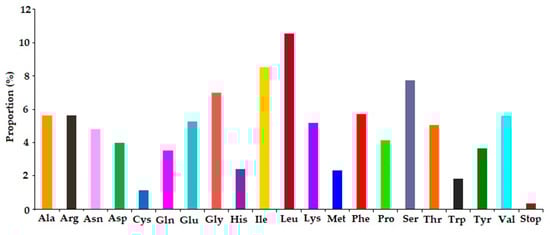 In this study, we analyzed codon usage frequency and the relative synonymous codon usage (RSCU) in the A. altissima plastome. All the protein coding genes presented a total of 68,952 bp and 22,964 codons in A. altissima chloroplast genome. Of 22,964 codons, leucine (Leu) being the most abundant amino acid had a frequency of 10.56%, then isoleucine (Ile) with 8.54%, while cysteine (Cys) was rare with a proportion of 1.12% (Tables S1 and S2, Figure 4). Our study species genome is like other previously reported genomes which showed that leucine and isoleucine are more common [41,42,43,44,45]. Furthermore, comparable to other angiosperm chloroplast genomes, our results followed the trend of codon preference towards A/T ending which was observed in plastomes of two Aristolochia species [46], Scutellaria baicalensis [47], Decaisnea insignis [34], Papaver rhoeas and Papaver orientale [48] Cinnamomum camphora [49], and Forsythia suspensa [41]. All the twenty-eight A/U—ending codons had RSCU values of more than one (RSCU > 1), whereas the C/G—ending codons had RSCU values of less than one. Two amino acids, Methionine (Met) and tryptophan (Trp) showed no codon bias. The results for number of codons (Nc) of each protein coding gene ranged from 38.94 (rps14 gene) to 58.37 (clpP gene).