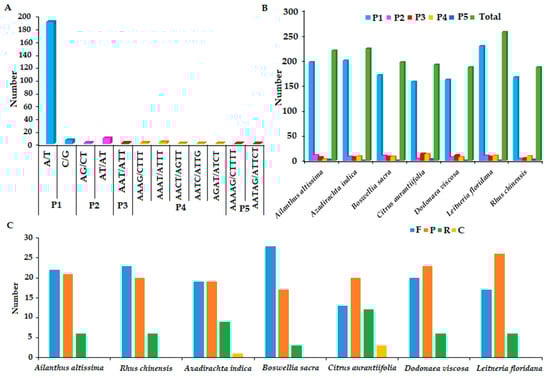Simple sequence repeat (SSRs) type, distribution and presence in A. altissima and other representative species from Sapindales. (A) Number of detected SSR motifs in different repeat types in A. altissima Chloroplast genome. (B) Number of identified repeat sequences in seven chloroplast genomes. (C) Number of different SSR types in seven representative species. F, indicate (forward), P (palindromic), R (reverse), and C (complement), while P1, P2, P3, P4, P5 indicates Mono-, di-, tri-, tetra-, and penta-nucleotides respectively. F: forward; P: palindromic, R: reverse; C: complement.