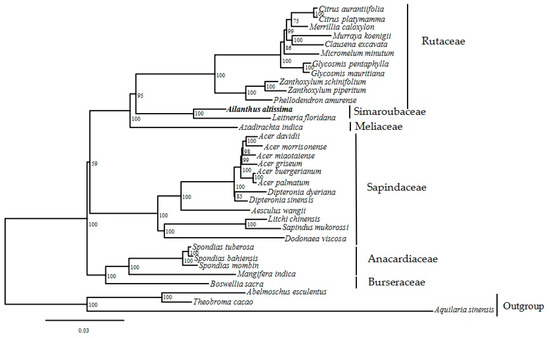 Phylogenetic tree of 31 Sapindales species with three outgroup Malvales species inferred from ML (Maximum likelihood) based on common protein coding genes. The position of A. altissima is shown in bold, while bootstrap support values are shown at each node.