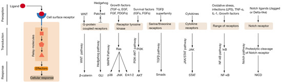 Overview of major cellular signalling process and pathways. Cell surface receptors receive instructional signals from the environment through interaction with extracellular ligands. This signal is then transduced across the plasma membrane where intracellular second messengers amplify and relay the information to elicit cellular responses. Ligands that utilise common signalling pathways and associated transcription factors are depicted in the left panel (an excellent resource for an overview of cellular signalling pathways can be found at the Internet resource: Cell Signaling Pathways by Michael Berridge [12]).