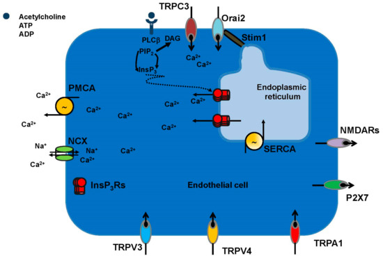 The Ca2+ signaling toolkit in brain microvascular endothelial cells. There is scarce information available regarding the molecular components of the Ca2+ signaling toolkit in brain microvascular endothelial cells. A recent investigation, however, provided a thorough characterization of the Ca2+ machinery in bEND5 cells [76], which represent an established mouse brain microvascular endothelial cell line. Further information was obtained by the analysis of endothelial Ca2+ signals in rodent parenchymal arterioles and in the human hCMEC/D3 cell line. Extracellular autacoids bind to specific G-protein-coupled receptors, such as M-AchRs and P2Y1 receptors, thereby activating PLCβ, which in turn cleaves PIP2 into InsP3 and DAG. InsP3 triggers ER-dependent Ca2+ releasing by gating InsP3Rs, while DAG could activate TRPC3. The InsP3-dependent drop in ER Ca2+ levels induces SOCE, which is mediated by the interaction between Stim1 and Orai2 in bEND5 cells. Moreover, extracellular Ca2+ entry may occur through TRPV3, TRPV4 and TRPA1, which are coupled to either eNOS or EDH [77,78]. Finally, brain microvascular endothelial cells may express Ca2+-permeable ionotropic receptors, such as NMDARs and P2X7 receptors. The elevation in [Ca2+]i decays to the baseline via the concerted interaction between SERCA and PMCA pumps, as well as through NCX [72,79,80]. Abbreviations: InsP3, inositol-1,4,5-trisphosphate; DAG, diacylglycerol; InsP3Rs, InsP3 receptors; NCX, Na+–Ca2+ exchanger; PMCA, plasma membrane Ca2+ ATPase; PIP2, phosphatidylinositol-4,5-bisphosphate; PLCβ, phospholipase Cβ; SERCA, sarco-endoplasmic reticulum Ca2+-ATPase. The thicker line connecting PIP2 to InsP3 indicates a high amount of second messenger produced upon PLCβ activation.