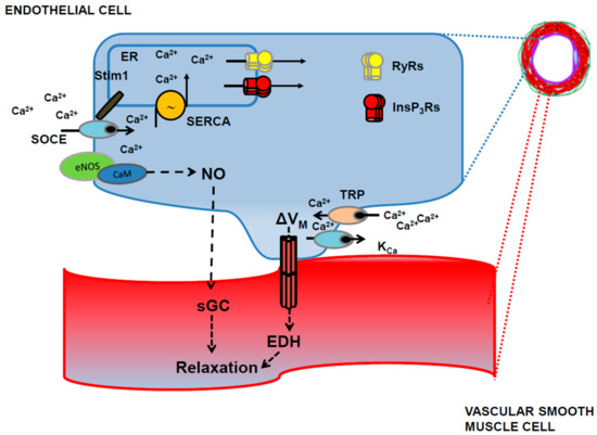 EDH provides the largest contribution to endothelial vasorelaxing mechanisms in resistance-sized arteries and arterioles, as shown in coronary, renal and mesenteric circulation [22,23,131,171]. EDH is initiated by an increase in endothelial [Ca2+]i, which stimulates IKCa (KCa3.1) and SKCa (KCa2.3) channels to hyperpolarize the endothelial cell membrane (Figure 4). Hyperpolarizing current spreads from vascular endothelium to overlying smooth muscle cells to trigger VSMC relaxation and vessel dilation by inhibiting voltage-dependent Ca2+ entry (Figure 4) [22,23,77]. This vasorelaxing mechanism requires a tightly-regulated disposition of the Ca2+ sources and the Ca2+-sensitive decoders, i.e., SKCa and IKCa channels, which effect membrane hyperpolarization. To achieve such a precise spatial arrangement, endothelial cells extend cellular protrusions through the internal elastic lamina, which establish a heterocellular coupling with adjacent smooth muscle cells through connexin-based myo-endothelial gap-junctions (MEGJs) [22,23,77]. The endothelial ER also protrudes into these myo-endothelial microdomain sites and forms spatially-discrete InsP3-sensitive Ca2+ pools, which are juxtaposed with IKCa channels, which are located on the endothelial protrusions traversing the holes in the vascular wall [23,172]. Conversely, SKCa channels are distributed throughout the endothelial cell membrane, although they are enriched at MEGJs and may, therefore, sense ER-released Ca2+ [173]. InsP3Rs are constitutively activated to produce repetitive, spatially-restricted Ca2+ release events, termed Ca2+ pulsars, whose frequency can be increased by extracellular vasoactive agonists, such as acetylcholine. Spontaneous InsP3-driven Ca2+ pulsars are selectively coupled to IKCa and SKCa channels, thereby hyperpolarizing the endothelial membrane potential at myo-endothelial projections and inducing dilation in adjoining VSMCs [172]. K+ signaling in the myo-endothelial space could then be boosted by the stimulation of endothelial inward rectifying K+ (Kir) channels or of Na+/K+ ATPase in VSMCs. In addition to InsP3-induced ER-dependent Ca2+ release, IKCa and SKCa channels can be activated by extracellular Ca2+ entry through TRPV4 channels, which is also largely expressed at MEGJs [174]. EDH does not only evoke local vasodilation at the site of endothelial stimulation; the hyperpolarizing current spreads along vascular endothelium to upstream arteries (up to ≈2 mm) and drives the retrograde vasodilation, which is ultimately responsible for the drop in vascular resistance that increases blood supply to active regions [175,176,177]. Preliminary data revealed that the same clustered architecture of TRPV4 and IKCa channels is maintained at MEGJs of rodent cerebral arteries [24,78,178,179,180], which suggests that discrete InsP3Rs-mediated Ca2+ pulsars arise also in parenchymal vessels [24]. Moreover, cerebral MEGJs are enriched with TRPA1 channels, which may also support EDH in cortical circulation [178,181]. EDH mediates ATP-, UTP- and SLIGR (a selective agonist of protease-activated receptor 2)-induced vasodilation in rat middle cerebral arteries [164,180,182,183,184,185] and acetylcholine-induced vasodilation in mouse posterior cerebral arteries [186].