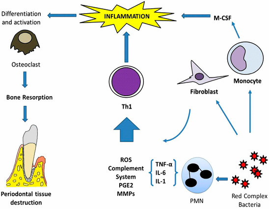 Pathophysiological mechanisms in periodontitis. The presence of red complex bacteria promotes periodontal inflammation in susceptible individuals. Activated polymorphonuclear neutrophils (PMN), fibroblast, and monocytes in the oral cavity induce production of cytokines such as tumour necrosis factor α (TNF-α), interleukin (IL)-1, and IL-6. The initial function of this inflammation is to protect against bacteria; however, chronic inflammation induces enhanced reactive oxygen species (ROS), complement system, and PGE2 and matrix metalloproteinases (MMPs) such as gelatinase B and collagenase 1. This inflammatory microenvironment induces a Th1 lymphocyte profile, which promotes inflammation and is associated with the maintenance and progression of the lesion. In addition, activated monocytes induce cytokines as M-CSF (macrophage colony-stimulating factor) that promote activation and differentiation of osteoclasts, which are related to resorption of alveolar bone, damage to cementum, and periodontal ligament.