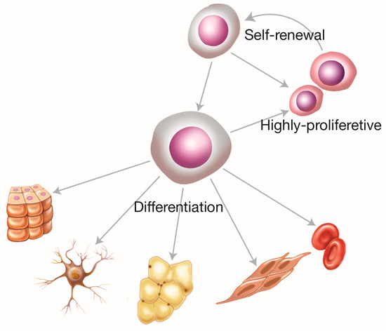 Mesenchymal stem cells (MSCs) are adult connective tissue cells that originate from the mesoderm. A stem cell is an undifferentiated cell that is distinguished by its capacity for autoregeneration (which perpetuates the population of stem cells) and by its capacity for asymmetric division, which indicates a daughter stem cell and another with greater commitment to proliferation and cell differentiation [27,28] (Figure 2).