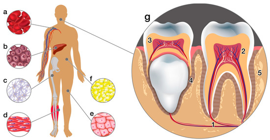 Sources of stem cells in the human organism. The diagram shows some tissue sources of adult stem cells. (a) Peripheral blood, (b) Liver, (c) Bone marrow, (d) Muscles, (e) Skin, (f) Adipose tissue, (g) Dental tissues: (1. Apical dental papilla, 2. Adult pulp, 3. Pulp of deciduous teeth, 4. Periodontal ligament, and 5. Alveolar bone).