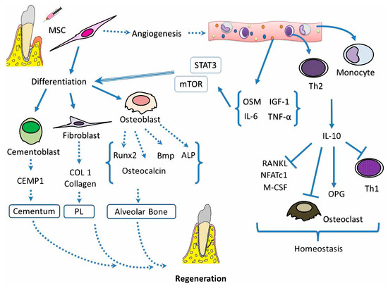 Putative mechanism involved in the regeneration of periodontal tissue via DP-MSCs. The placement of DP-MSCs allows the neoformation of blood vessels that carry signals (IL-6, IGF-1, and TNF-α andoncostatin M: OSM) and cells (Th2 and monocytes) to the site of the lesion. Signals, via the STAT3 and mTOR pathways, will allow the DP-MSCs to be transformed into osteoblasts, which in turn will produce ligands to bone morphogenic protein 2 (BMP), alkaline phosphatase (ALP), and runt-related transcription factor 2 (Runx2) for the generation of alveolar bone, whereas the production of IL-10 and osteoprotegerin (OPG) will create a suitable microenvironment in which osteoclast activity is inhibited and tissue repair is promoted. On the other hand, DP-MSCs also differentiate into cementoblasts and fibroblast, which secrete proteins such as CEMP1 and COL1 for synthesis of cementum and collagen fibres of the periodontal ligament, respectively. Finally, the neoformation of blood vessels, an environment with the indicated signals and the differentiation of DP-MSCs into the constituent cells of the periodontium, will jointly achieve the regeneration of periodontal tissues.PL: Periodontal ligament; Bmp: Bone morphogenic protein; RANKL: Receptor activator of nuclear factor kappa-Β ligand; NFATc1: Nuclear factor of activated T-cells, cytoplasmic 1; M-CSF: Macrophage colony-stimulating factor.